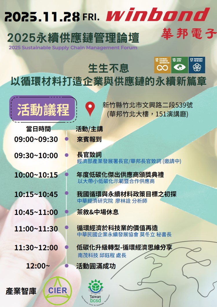 華邦電子 謹訂於 2025/11/28(五)上午 9:00–12:00 辦理「永續供應鏈管理論壇」